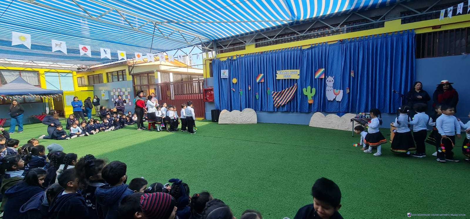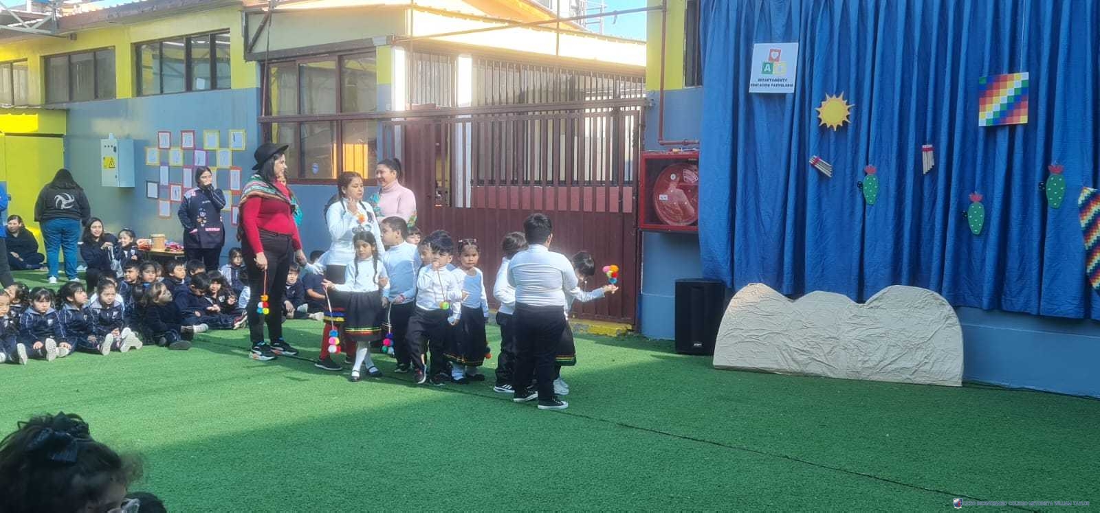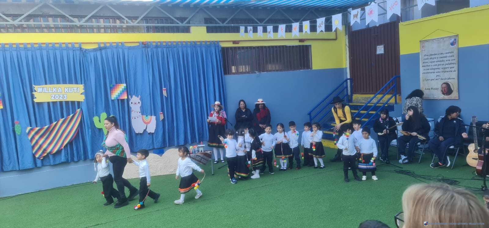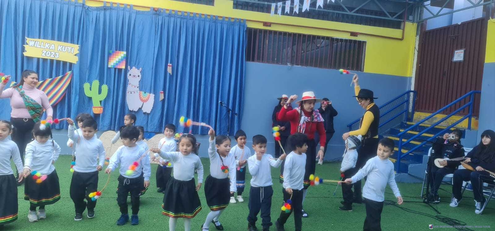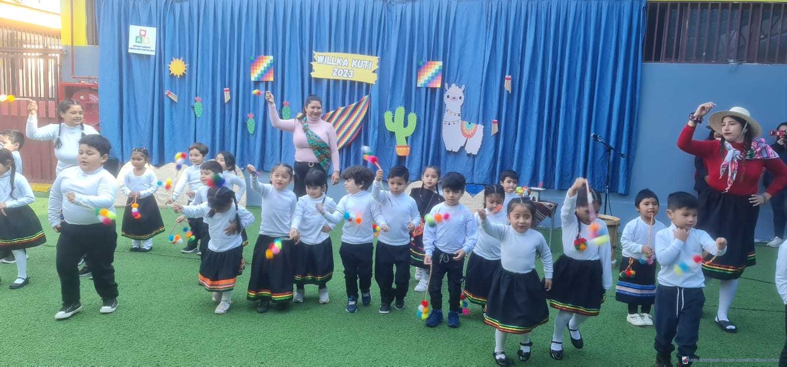 Los alumnos del prekínder B, liderados por la profesora Katherine Meneses, y acompañados por las asistentes técnicas, la profesroa de Lengua Aymara Lenka Gárate y las tías de pie, organizaron una jornada llena de actividades y enseñanzas para los niños y niñas de prekínder y kínder, con el objetivo de acercarlos a la cultura y cosmovisión aymara. Durante la semana previa, los estudiantes aprendieron sobre las tradiciones y rituales asociados al Willka Kut’i, así como su importancia para las comunidades indígenas.