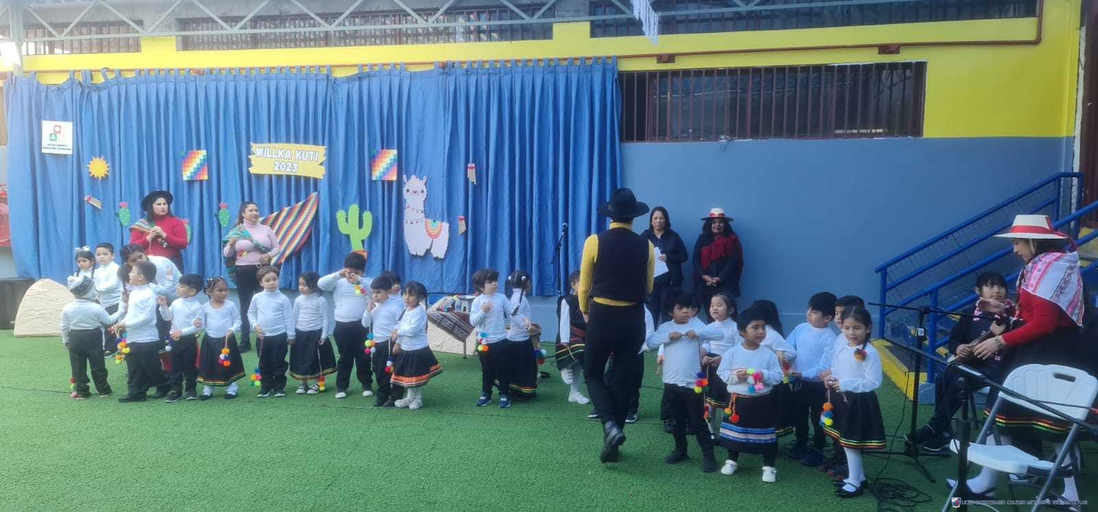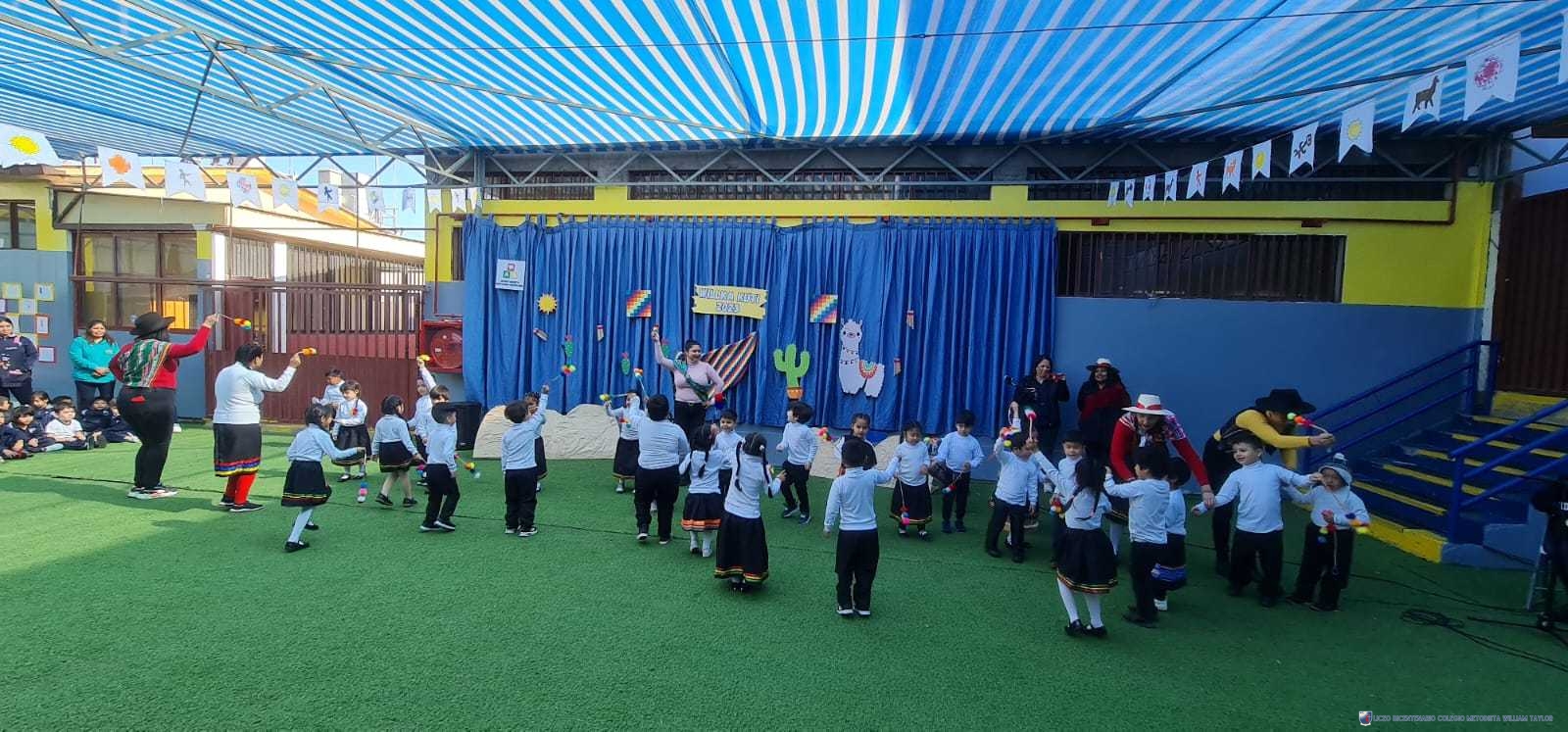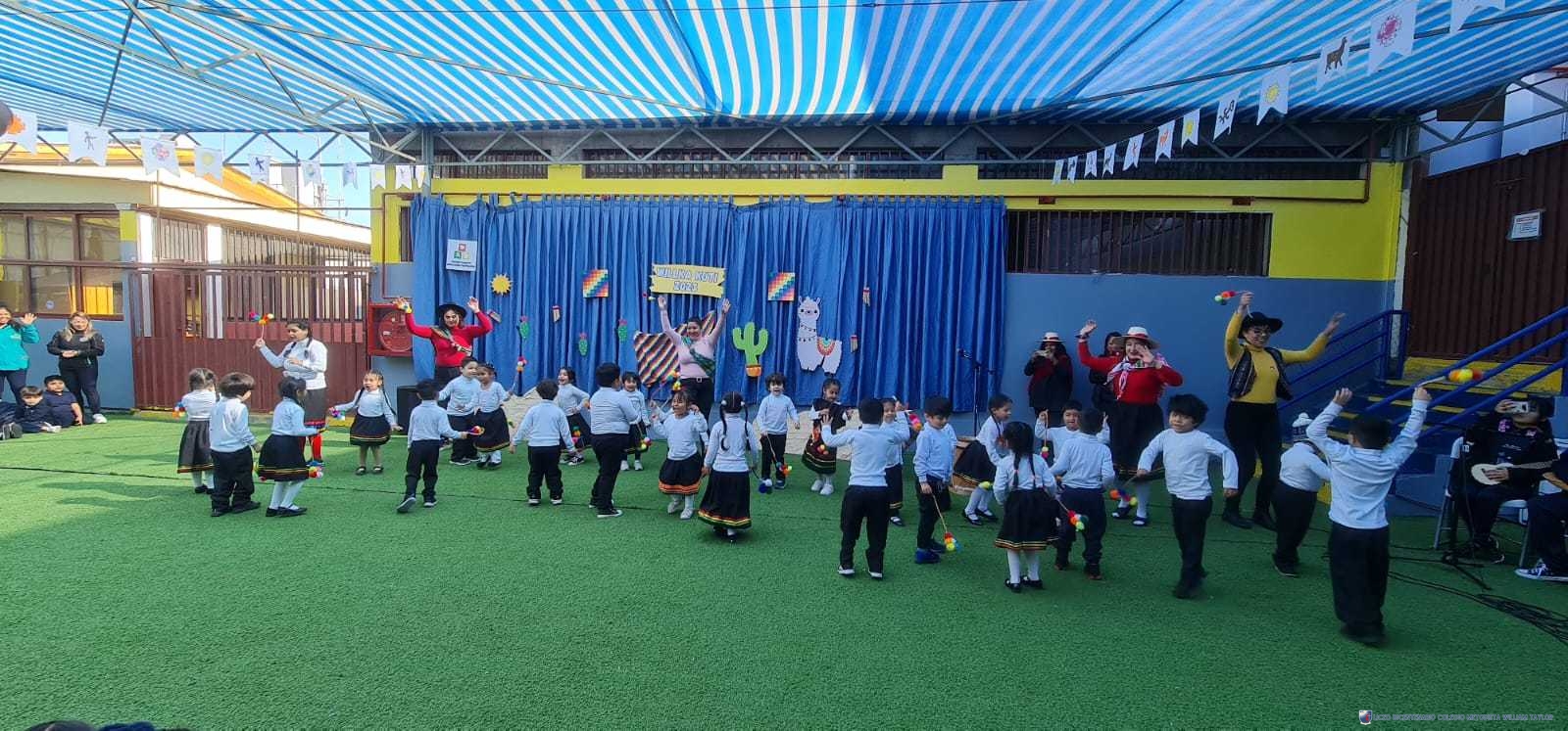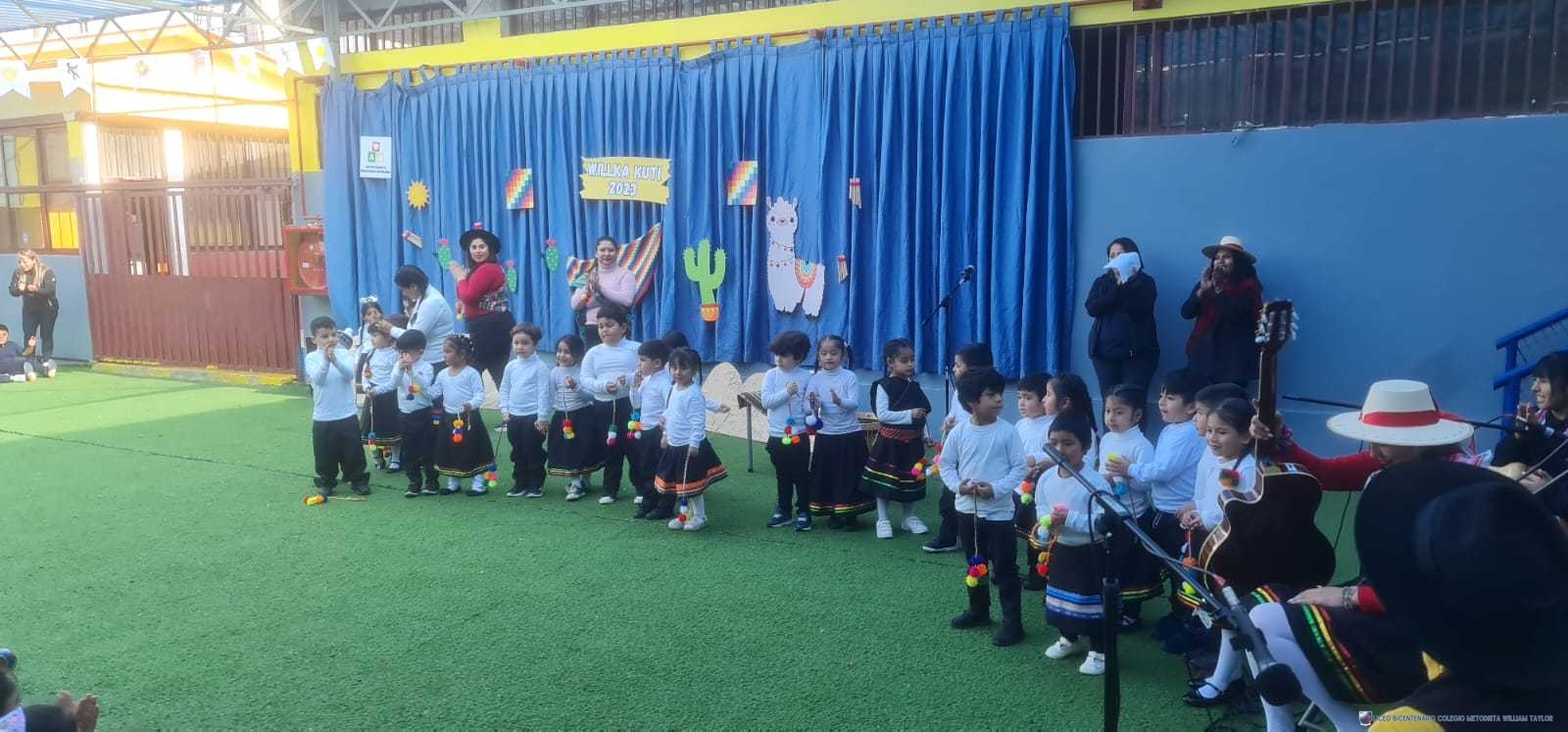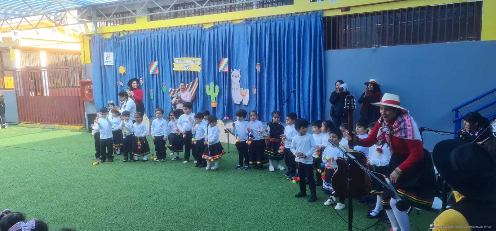 Los alumnos del prekínder B, liderados por la profesora Katherine Meneses, y acompañados por las asistentes técnicas, la profesroa de Lengua Aymara Lenka Gárate y las tías de pie, organizaron una jornada llena de actividades y enseñanzas para los niños y niñas de prekínder y kínder, con el objetivo de acercarlos a la cultura y cosmovisión aymara. Durante la semana previa, los estudiantes aprendieron sobre las tradiciones y rituales asociados al Willka Kut’i, así como su importancia para las comunidades indígenas.