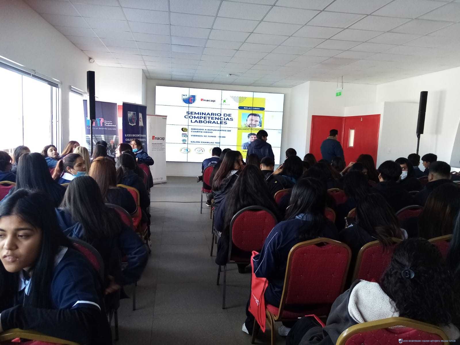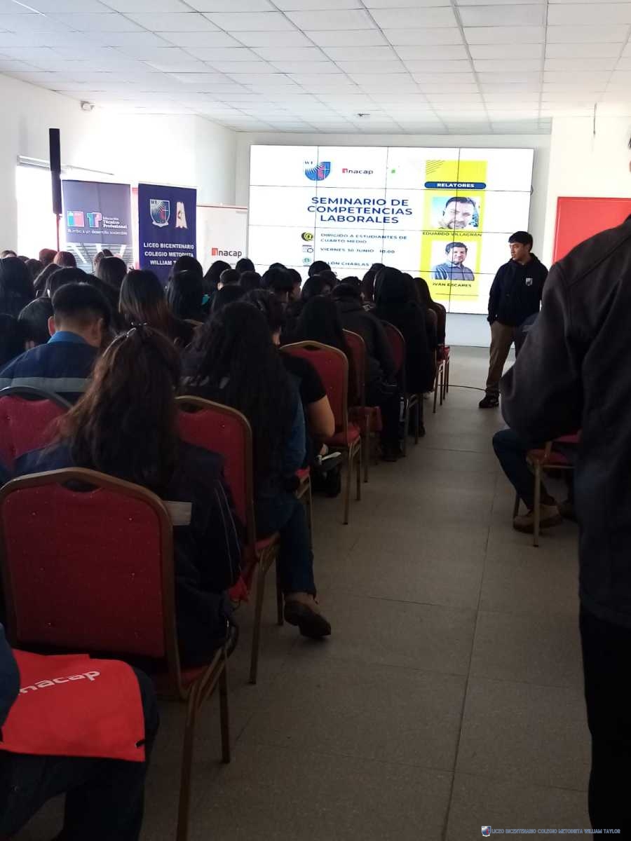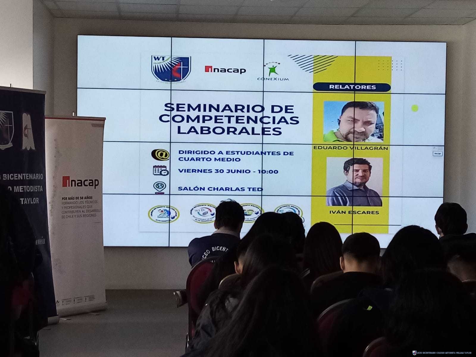Esta semana, estudiantes de cuartos medios, asistieron al primer Seminario de Competencias Laborales, con la participación de los relatores Iván Escares (Conexium) y Eduardo Villagrán (INACAP). Su objetivo principal fortalecer y potenciar las competencias esenciales de la estudiantes de las 4 especialidades con foco en las habilidades y actitudes desde la mirada del sector empresarial acorde a la realidad del SXXI.
