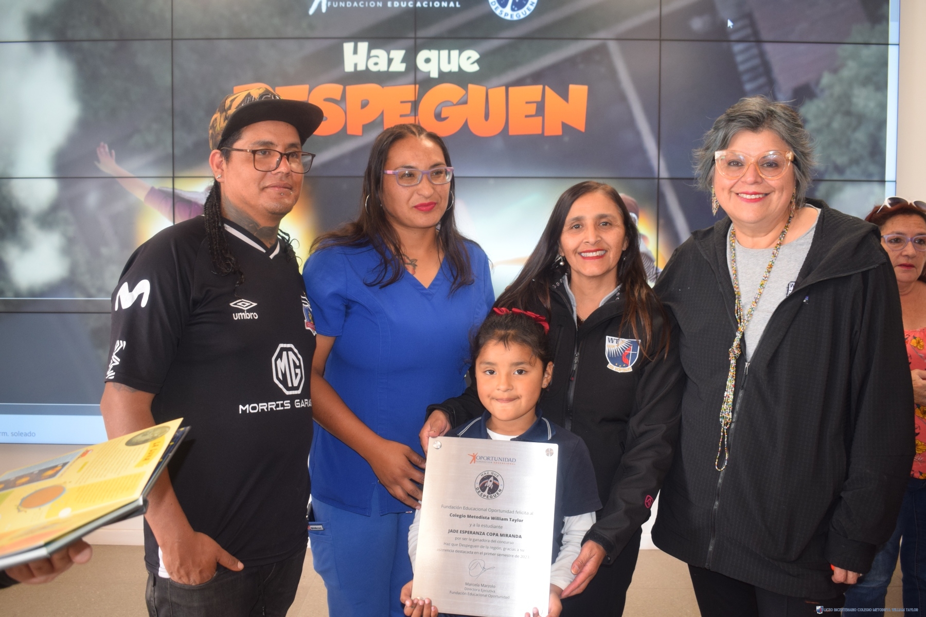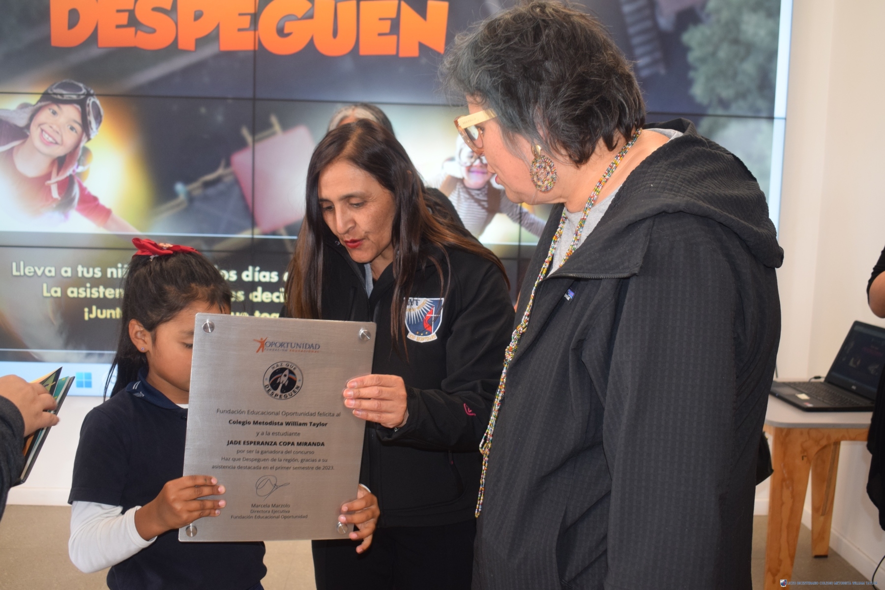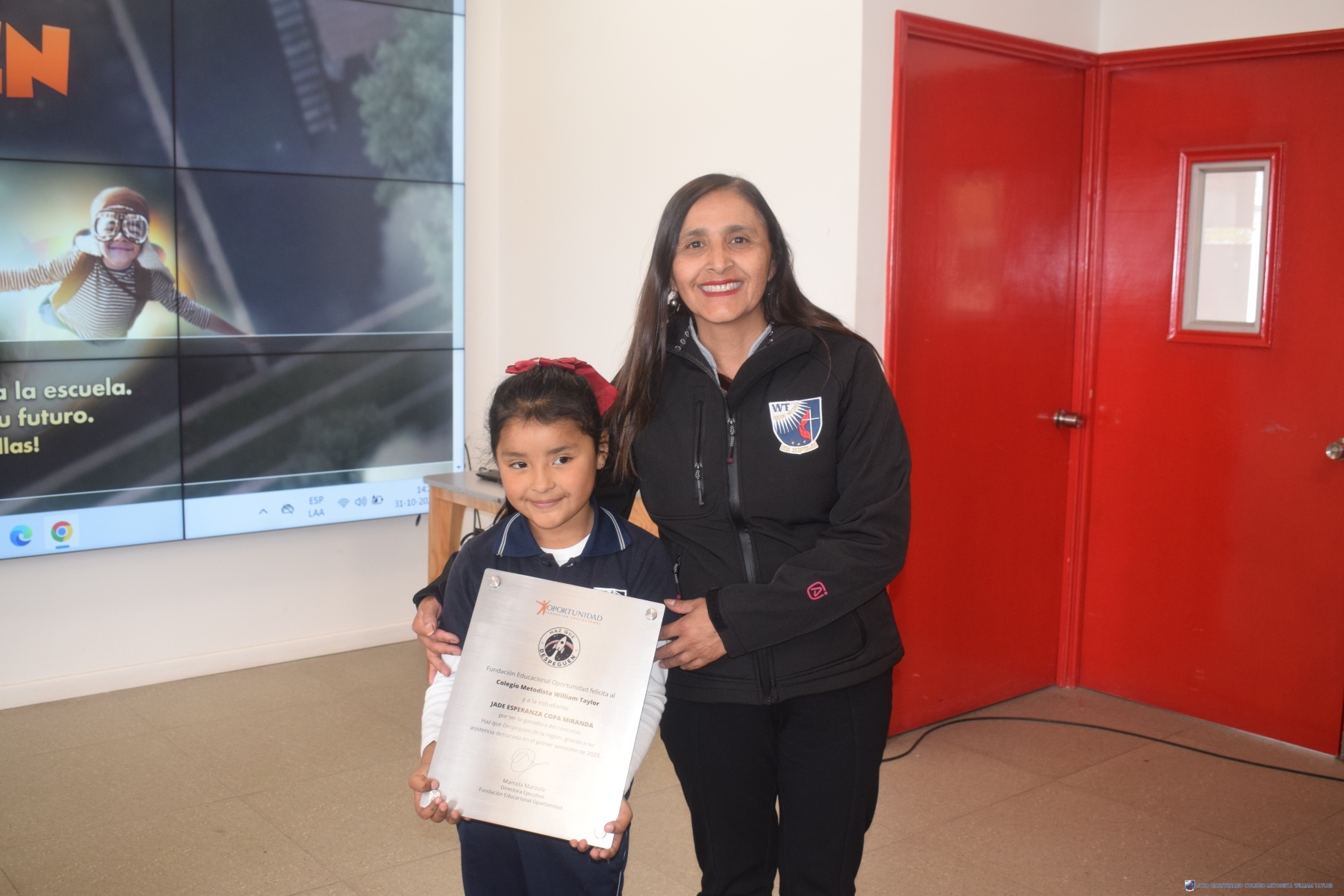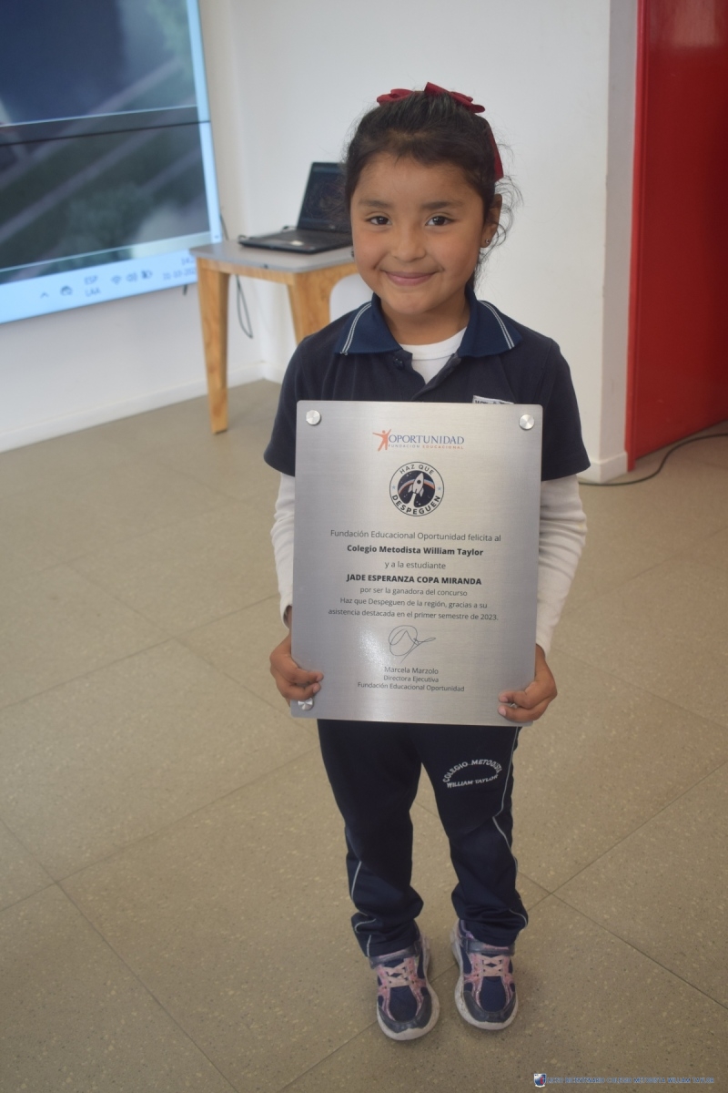 Con la presencia de representantes de la “Fundación Oportunidad”, celebramos con orgullo la ceremonia de reconocimiento en honor a Jade Copa Miranda, estudiante de Kínder en nuestro Liceo Metodista Bicentenario William Taylor. Jade ha sido distinguida como una de las ganadoras del viaje al Centro Espacial Kennedy de la NASA, gracias a su destacada participación en la campaña “Haz que Despeguen” de esta Fundación, que fomenta la asistencia regular de los estudiantes en la primera infancia.